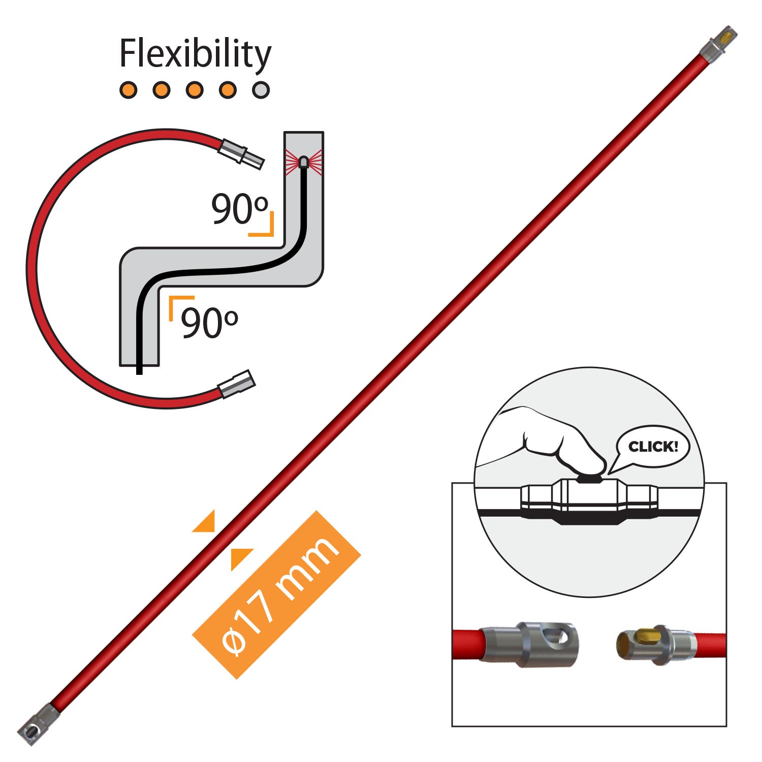 ✔ reaches difficult areas with flexible rods