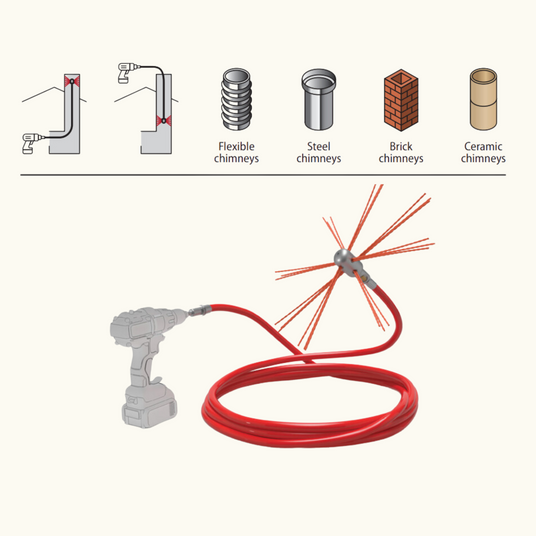 The Tornado Cobra uses a rotary cleaning system powered by a drill. The flexible rods and specialized brushes efficiently remove soot, creosote, and blockages from your chimney.