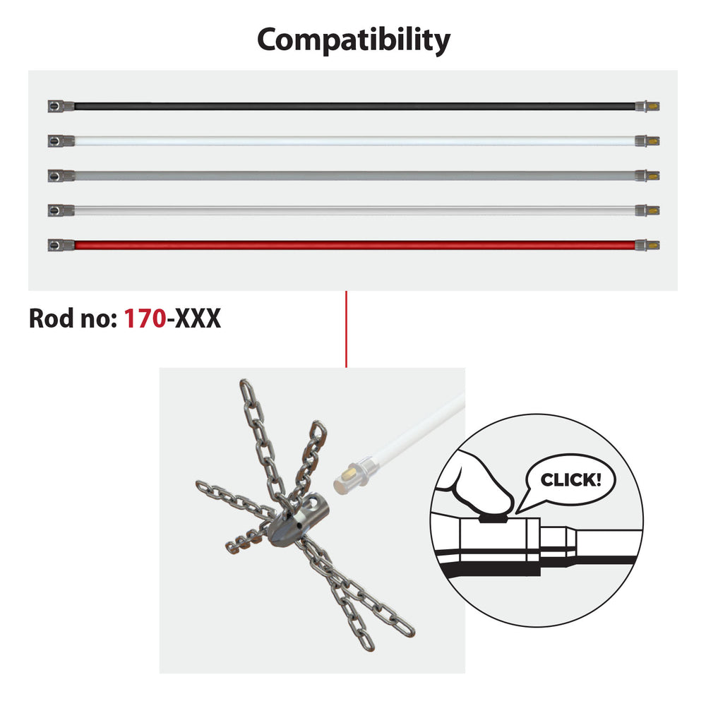 Šepečio galvutė su nerūdijančio plieno grandine, ø 30 cm skersmens: Ši didelio atsparumo šepečio galvutė specialiai sukurta kietoms kreozoto ir dervos nuosėdoms iš kaminų ir dūmtraukių šalinti. Nerūdijančio plieno grandinė suteikia papildomo tvirtumo sunkiai pašalinamoms sankaupoms ir gali būti pakeista, kai susidėvi, taip pailginant įrankio tarnavimo laiką.