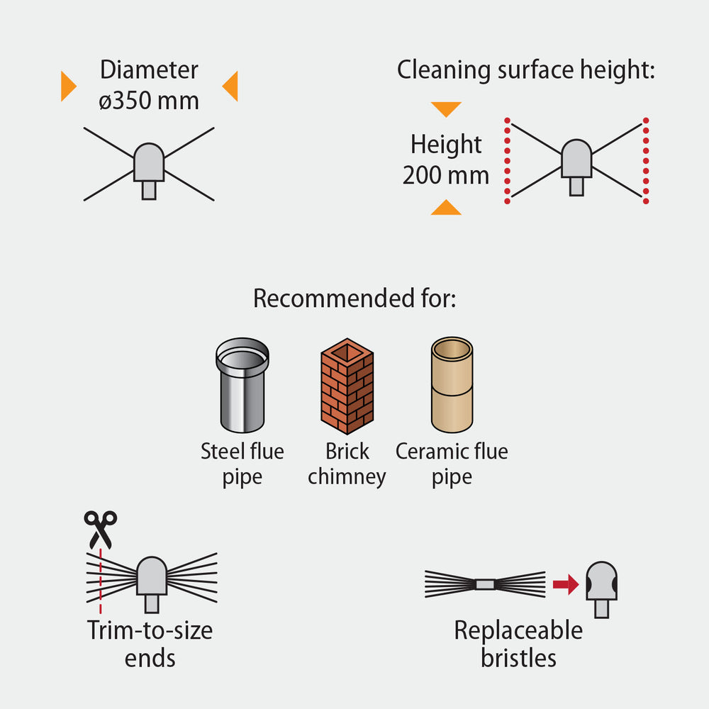 Borstelkop met nylon borstelharen: De borstelkop heeft duurzame nylon borstelharen die effectief reinigen zonder de oppervlakken van je schoorsteen of kanalen te beschadigen.