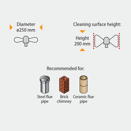 Veilig voor alle soorten schoorstenen. Te gebruiken op metaal, baksteen of elk oppervlak. Maximale schoorsteenhoogte voor reiniging van onderaf - 20 meter.