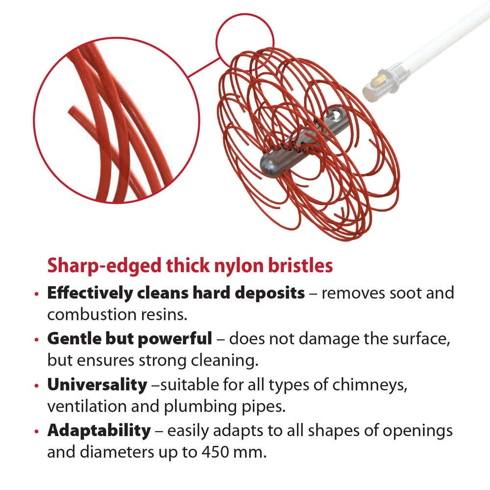 Metalen schoorstenen: De nylondraden zijn zacht genoeg om metalen oppervlakken niet te beschadigen, maar stevig genoeg om roet en teer effectief te verwijderen. Ze kunnen ook moeilijk bereikbare plaatsen bereiken.